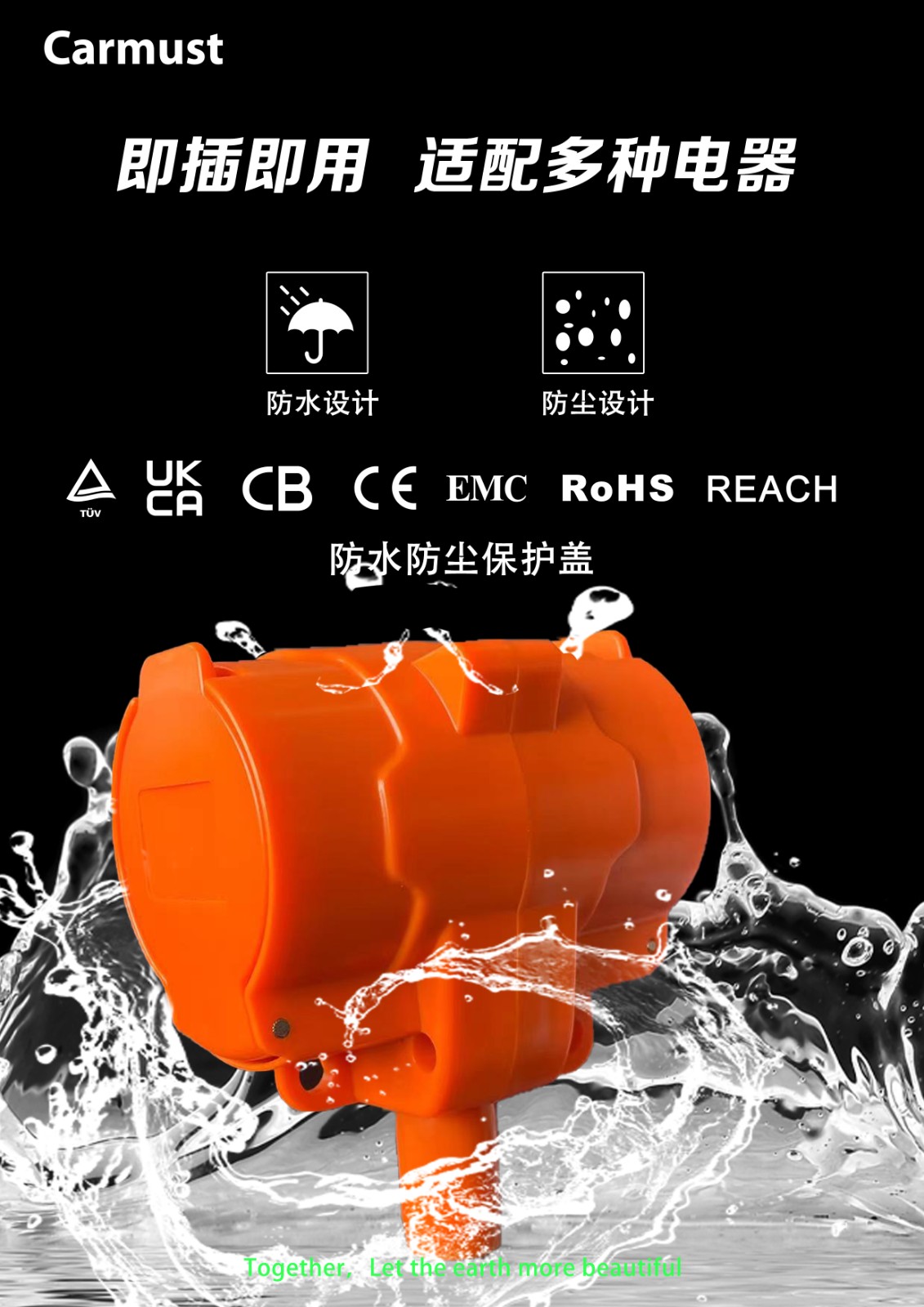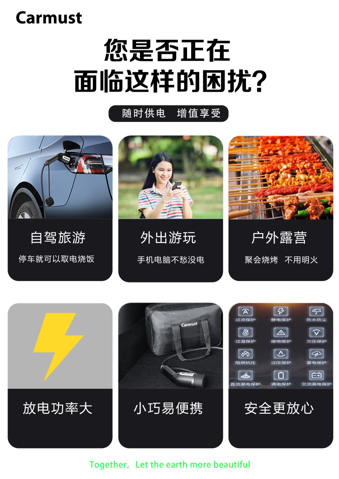 安全保护: 产品过温保护 继电器故障检测 过流保护 过压保护欠压保护 漏电保护 插头温度保护 未接地保护短路保护 设备/连接异常保护 汽车充电系统异常保护