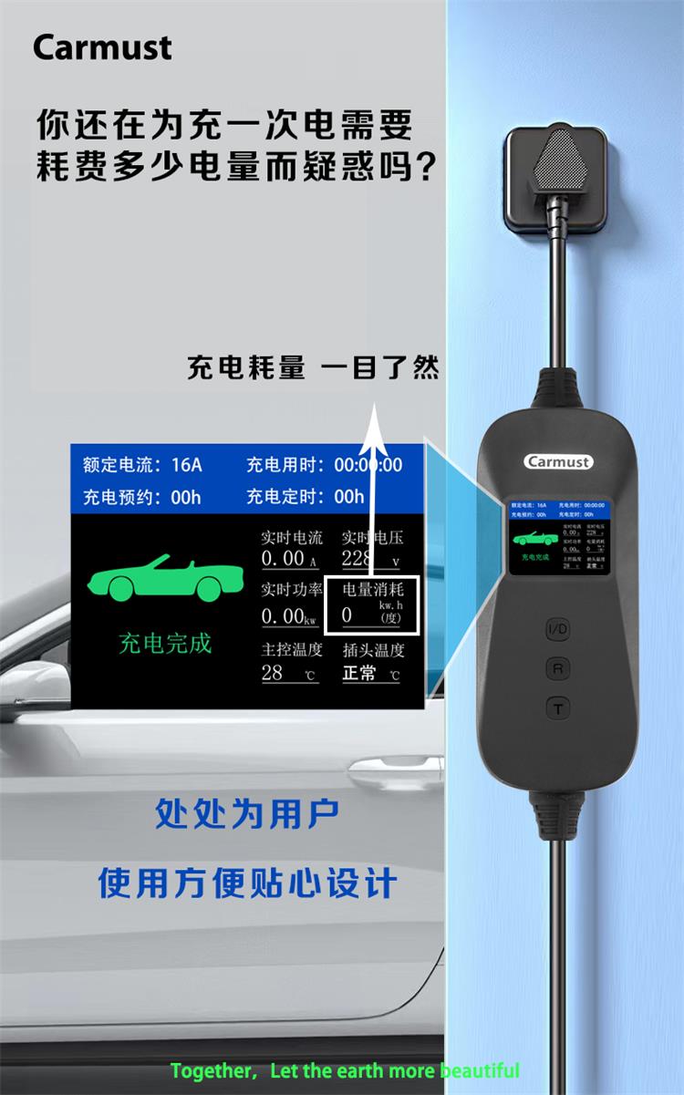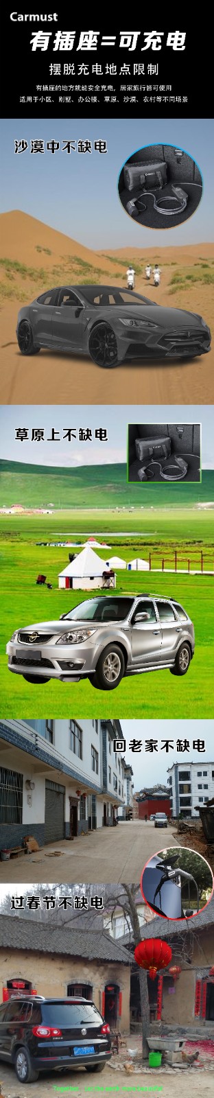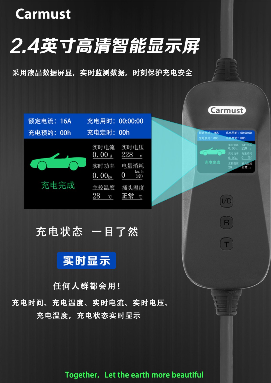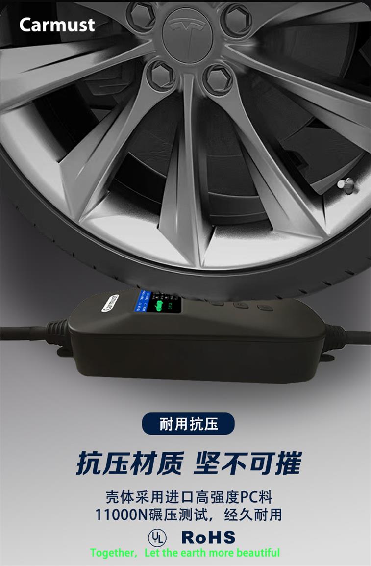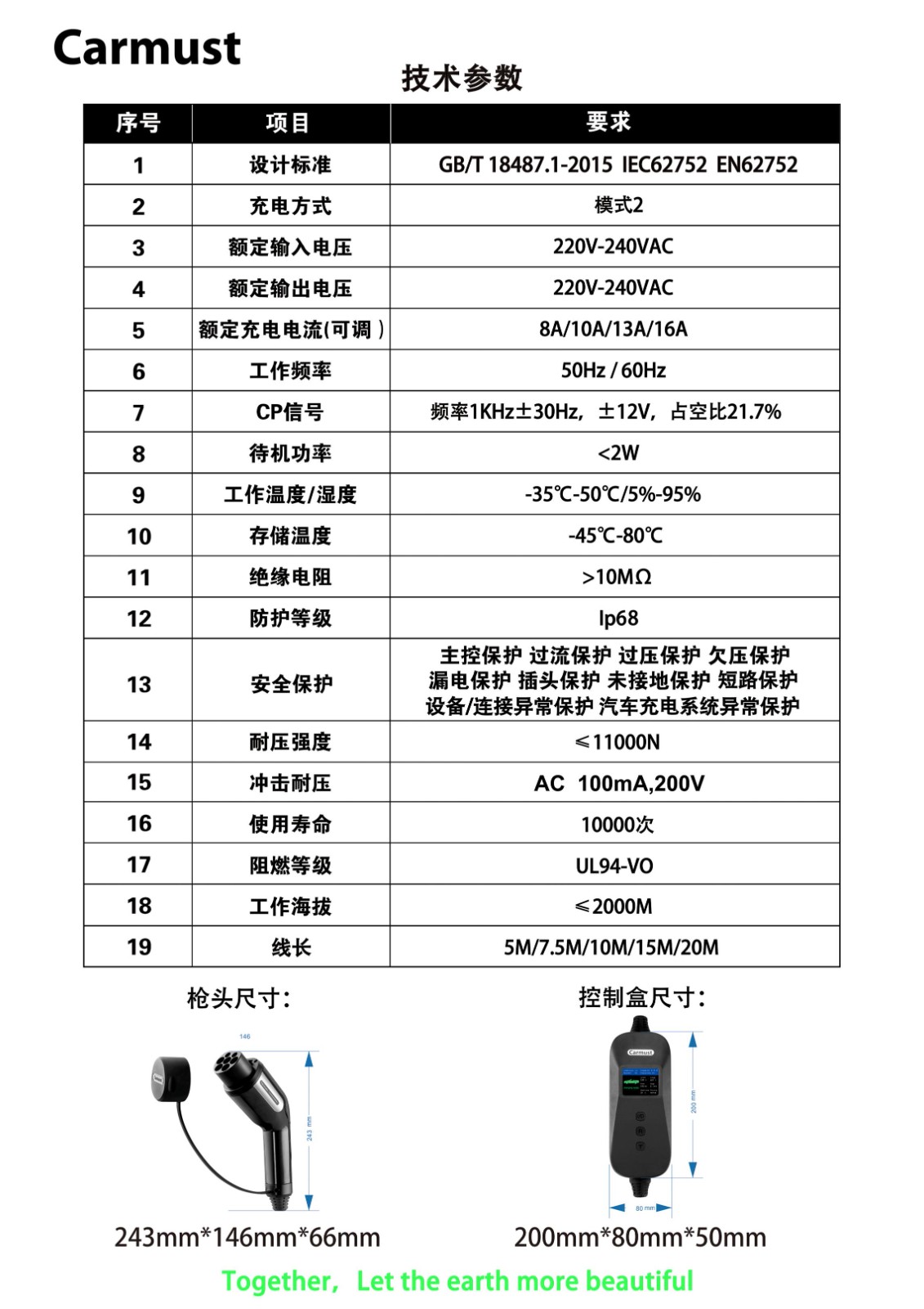安全保护: 产品过温保护 继电器故障检测 过流保护 过压保护欠压保护 漏电保护 插头温度保护 未接地保护短路保护 设备/连接异常保护 汽车充电系统异常保护